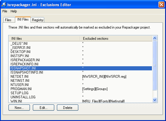 | New | Displays the INI File Exclusion Information dialog box from which you can specify additional .ini file exclusions. |