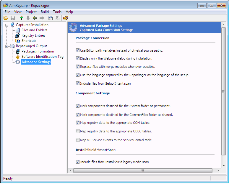 - In the Repackager interface, open the Repackager project that you want to convert to an InstallShield Editor project and build a Windows Installer package.