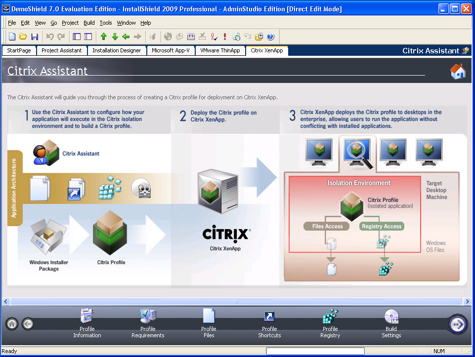 The Citrix Assistant Home page displays a diagram that illustrates the process of creating a Citrix profile for deployment on Citrix XenApp.