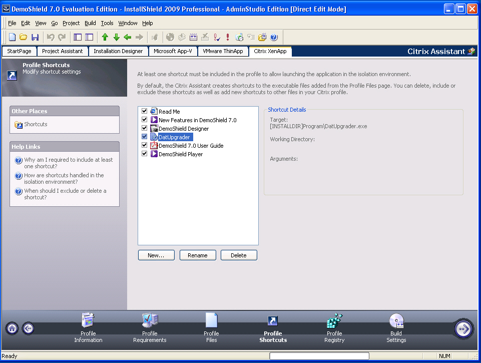 • Deleting a Shortcut—When you delete a shortcut, it is removed from both the Citrix profile and the InstallShield project. This means that the shortcut would also be deleted from the Windows Installer package that is built from this InstallShield project. See Deleting a Shortcut.