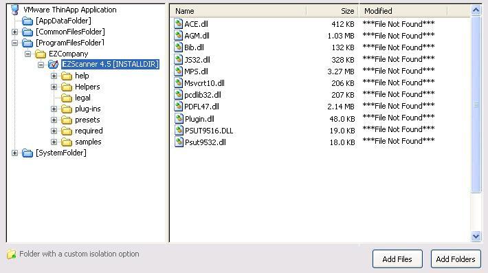On the Files & Folders page, you can view all of the files and folders that are currently in your ThinApp application, add new files and folders to include in the ThinApp application, and delete files and folders from the ThinApp application.