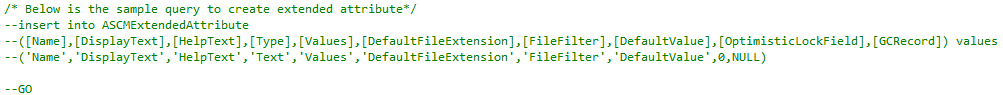 1. For each extended attribute that you want to define in the ApplicationExtendedAttributes.SQL script, copy the following three lines of code (without the leading hyphens):