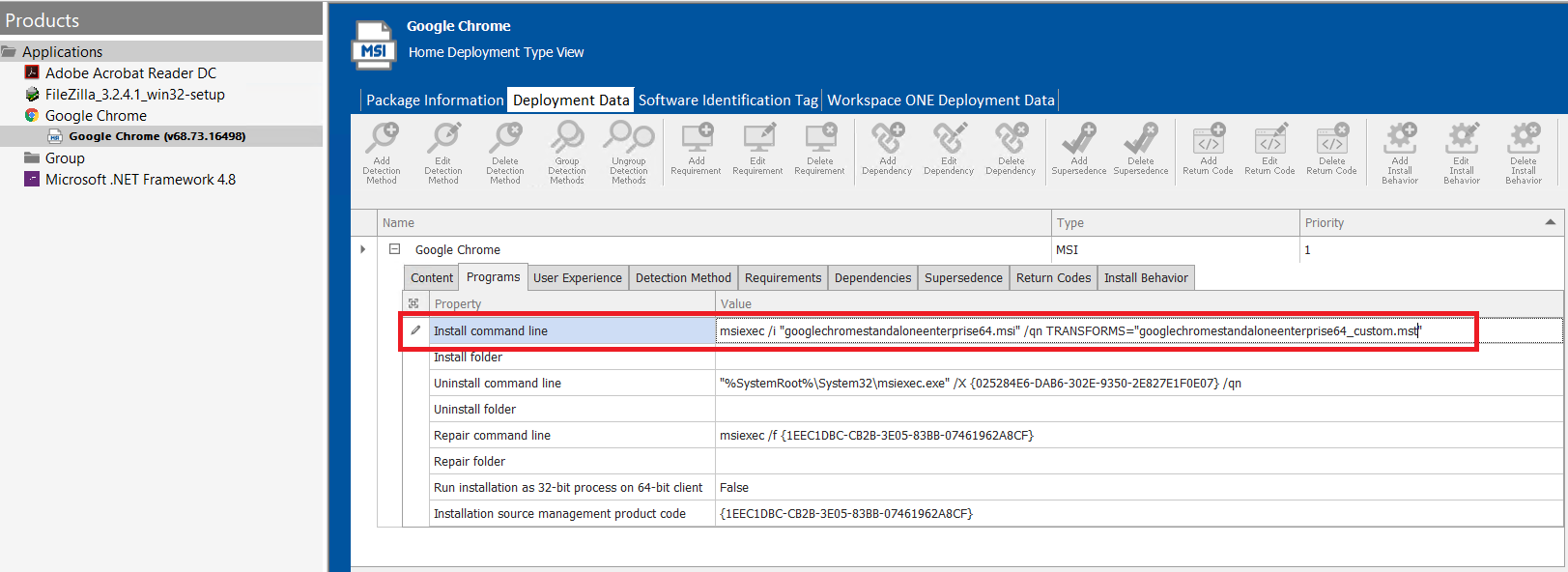 • On successful import of an application into the Application Catalog Tree, you can see the Install Command line and Uninstall Command Line for the selected application in Deployment Data >> Programs >> Install Command Line and Uninstall Command Line .
