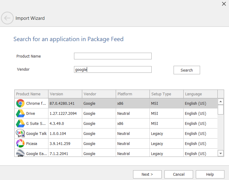 7. Click Next . When using the Package Feed Module, dynamic custom panels will appear in the Import Wizard based on the settings defined for each package. For example, when importing the Google Chrome package, several dynamic custom panel will appear, including the Options panel. ![](/images/Options panel.PNG)