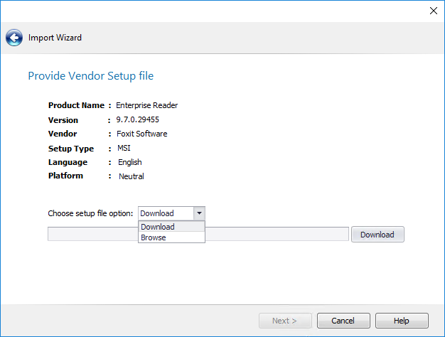 5. When you have finished downloading the setup file to the package feed configured download path, click Next . The Silent Command Line Arguments panel loads.