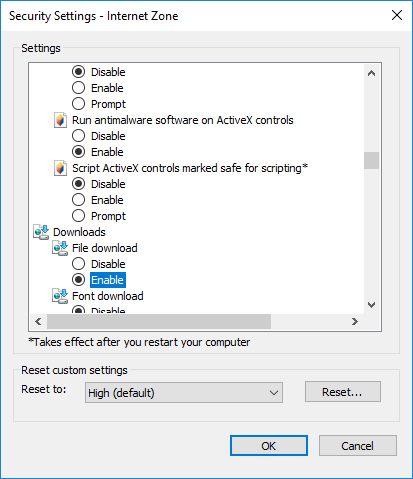 Make sure download option is enabled in your IE browser. Navigate to Tools (Alt+X) >> Internet options >> Security tab >> Custom level... >> Downloads >> select Enable