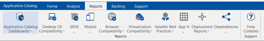 The ribbon interface includes the Application Catalog tab menu, along with buttons that are grouped in four additional tabs: Home , Analyze , Reports , Backlog , Support , and Getting Started .