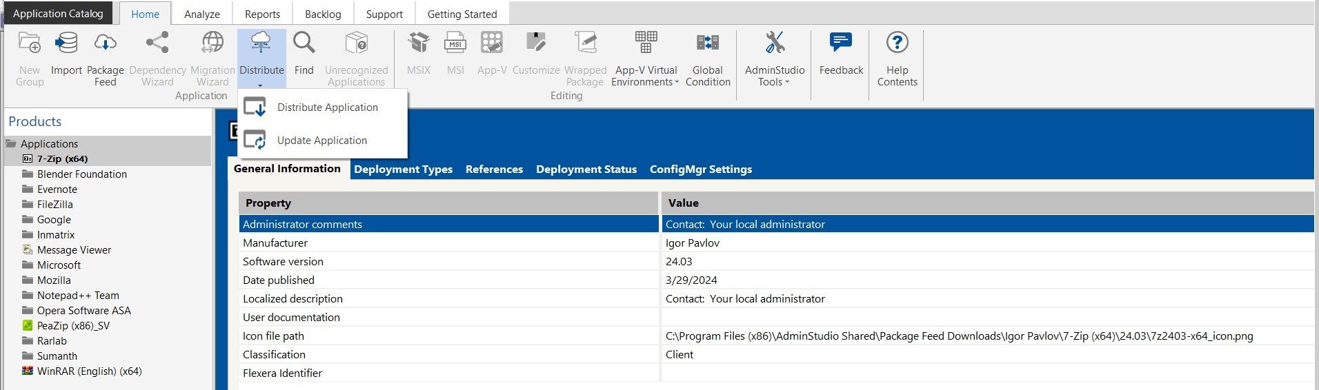 - In the Application Catalog tree, select the application or group of applications, and click the Distribute drop down in the ribbon and select Distribute Application or right-click and select Distribute Application from the context menu.