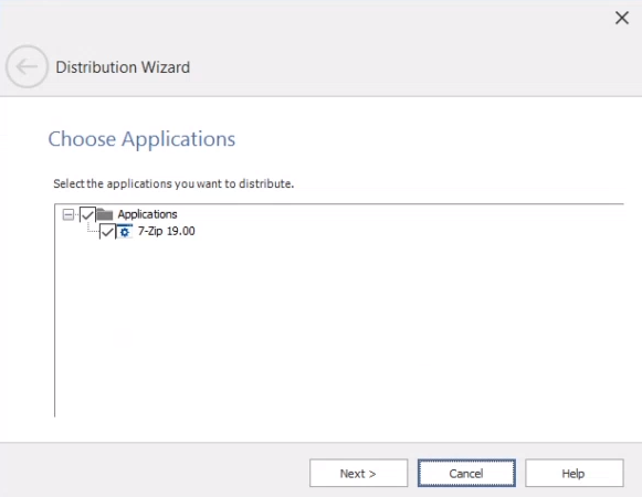 - The Choose Applications panel under Distribution Wizard opens. Select the applications, and then click Next .