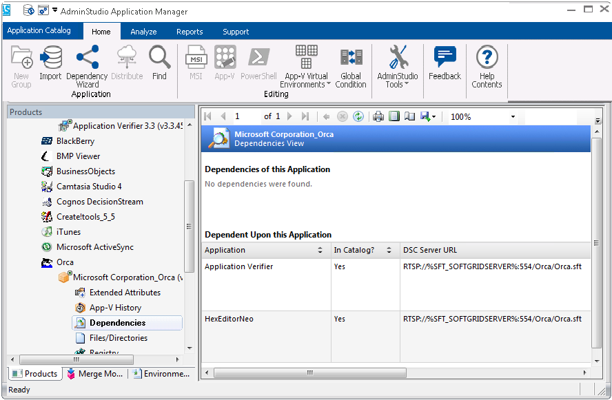 - This view lists both the applications this App-V package is dependent on and the applications dependent upon this App-V package. For each dependency, the following information is listed: