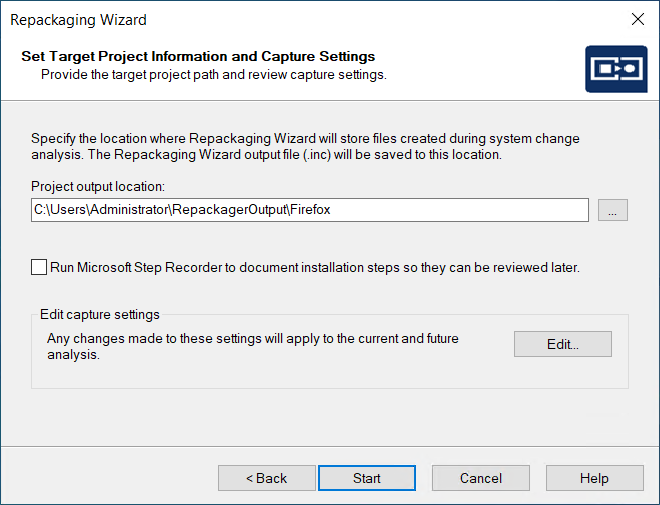 - To begin the repackaging process, click Start on the Set Target Project Information and Capture Settings Panel. The Repackaging Panel opens and the Repackaging Wizard captures the initial system status. Then, the selected setup program will be launched.