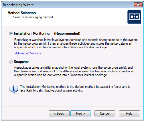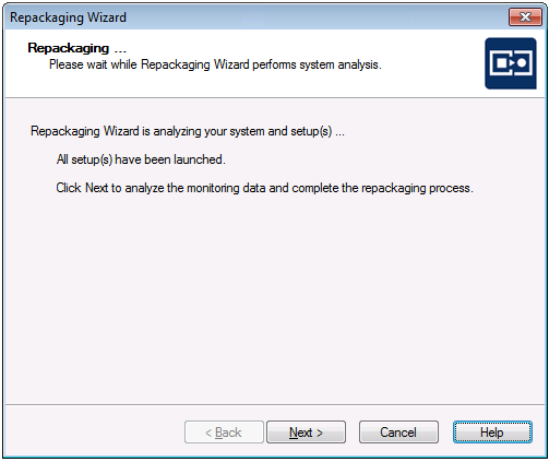 - When you are ready to complete the repackaging process, click Next . The Repackaging Wizard then analyzes the system and setup data that it collected.