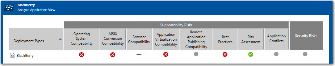 Analyze provides summary views that show display a status icon for groups and applications to indicate their overall test status in each of the following categories: