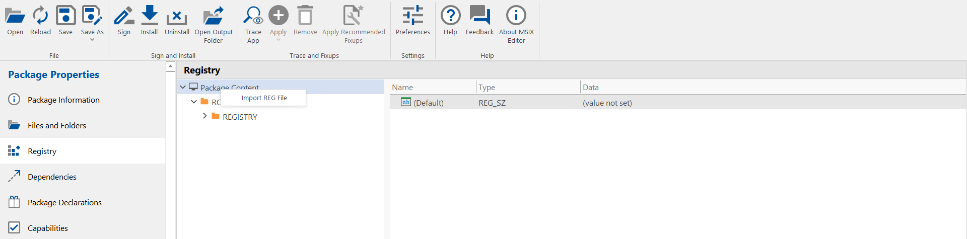 - In the Registry pane, right-click on Package Content node, and then select Import REG file .