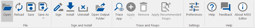The main tasks that you perform using MSIX Editor involves clicking one of the following buttons on the ribbon: