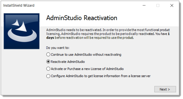 - Launch AdminStudio to see the AdminStudio Reactivation wizard.