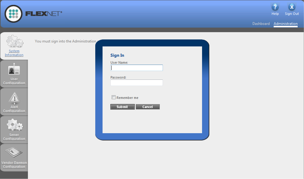http://localhost:<Port>Portis the HTTP port number that is used to host the Web server; this is configured when the FlexNet Licensing Server software is installed. The default port number is 8090.- If you are using a different machine (one that is not your FlexNet Licensing Server), visit the following site: